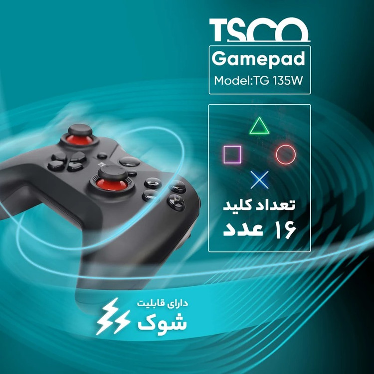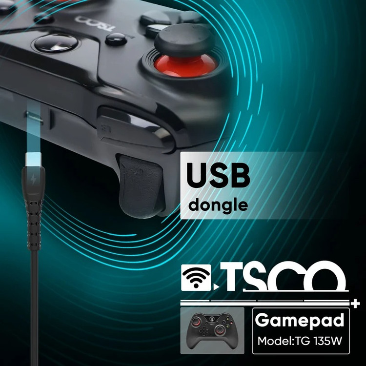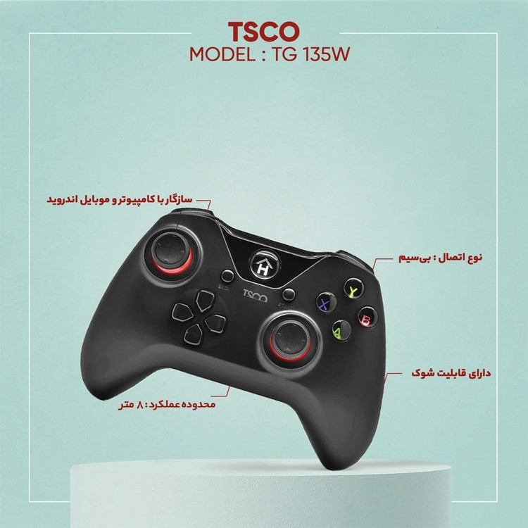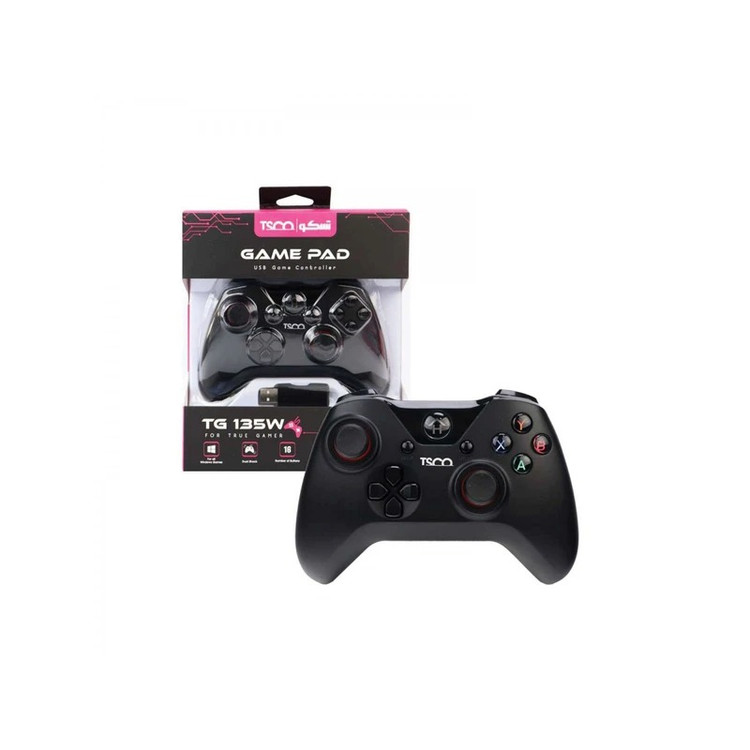 دسته بازی تسکو مدل «TG 135W» دارای یک باتری لیتیوم پلیمری با ظرفیت 400 میلیآمپر ساعت است که در مدت زمان 3 ساعت شارژ شده و پس از شارژ کامل امکان استفاده به مدت 6 تا 8 ساعت را به شما میدهد. این گیم پد بیسیم بوده و با استفاده از یک دانگل USB به کامپیوتر شما متصل میشود. قابلیت مهمی که درباره این دسته بازی میتوان گفت، این است که به موبایل اندروید شما متصل شده و میتوانید بازیهای موبایل را با استفاده از آن انجام دهید. محدوده عملکرد این دسته در حدود 8 متر است که میزان مناسبی به شمار میرود. تعداد دکمهها در این دسته 16 عدد بوده و یکی از ویژگیهای آن داشتن ویبره دوگانه است که حس هیجان بهتری را در هنگام بازی به کاربر منتقل میکند.