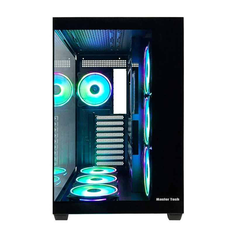 کیس کامپیوتر Master Tech TERABOX PLUS یک Mid Tower آکواریومی دوطرفه است که با ترکیب فلز و شیشه سکوریت، هم مقاومت فیزیکی بالایی دارد و هم نمایش داخلی چشمگیر برای اسمبلهای پیشرفته فراهم میکند. ابعاد این کیس ۴۴۸×۴۲۴×۲۸۵ میلیمتر و وزن آن ۸.۶ کیلوگرم است؛ بدنه مستحکم و ابعاد متعادل آن فضای کافی برای نصب سختافزارهای سنگین بدون فدا کردن پایداری سازه ایجاد میکند. سازگاری با مادربردهای ATX، microATX و Mini‑ITX، انعطاف بالایی در انتخاب پیکربندیهای مختلف به کاربر میدهد. محدودیت ارتفاع کولر پردازنده ۱۶۰ میلیمتر بوده که بیشتر مدلهای هوایی متوسط و برخی مدلهای بزرگ را پوشش میدهد. طول کارت گرافیک تا ۴۱۵ میلیمتر پشتیبانی میشود، بنابراین کارتهای سهفن و حتی نسخههای طولانیتر به راحتی قابل نصب هستند. طراحی محل پاور در دیواره کناری با فرم فاکتور ATX PS2، ضمن بهینهسازی فضای داخلی، مسیر کابلکشی را کوتاهتر کرده و تعادل توزیع وزن را بهبود میبخشد. وجود ۹ اسلات توسعه امکان نصب کارتهای جانبی متعدد را فراهم میکند. سیستم تهویه این مدل با ۱۰ جایگاه فن بسیار گسترده بوده و شامل سه فن در سقف، سه فن در کف، سه فن در پنل کناری و یک فن در پشت است. ۷ فن ۱۲۰ میلیمتری پیشنصبشده جریان هوای اولیه را تضمین میکنند، و قابلیت نصب رادیاتور واترکولینگ تا ۳۶۰ میلیمتر، آن را آماده خنکسازی قطعات پرمصرف میسازد. در بخش ذخیرهسازی، سه جایگاه ۲.۵ اینچی برای SSD و دو جایگاه ۳.۵ اینچی برای HDD در نظر گرفته شده است. پنل جلویی مجهز به یک پورت USB 3.2 Type‑C، دو پورت USB 3.0 و دو جک صوتی ۳.۵ میلیمتری است که ارتباط سریع با لوازم جانبی و تجهیزات مدرن را فراهم میکند. سیستم مدیریت کابل و فیلتر گردوغبار داخلی، نگهداری و اسمبل تمیز سیستم را تسهیل میکنند. این کیس با سازگاری کامل با مادربردهای BTF، گزینهای مناسب برای پیکربندیهای مدرن با تمرکز بر دوام شاسی و تهویه پرقدرت محسوب میشود.